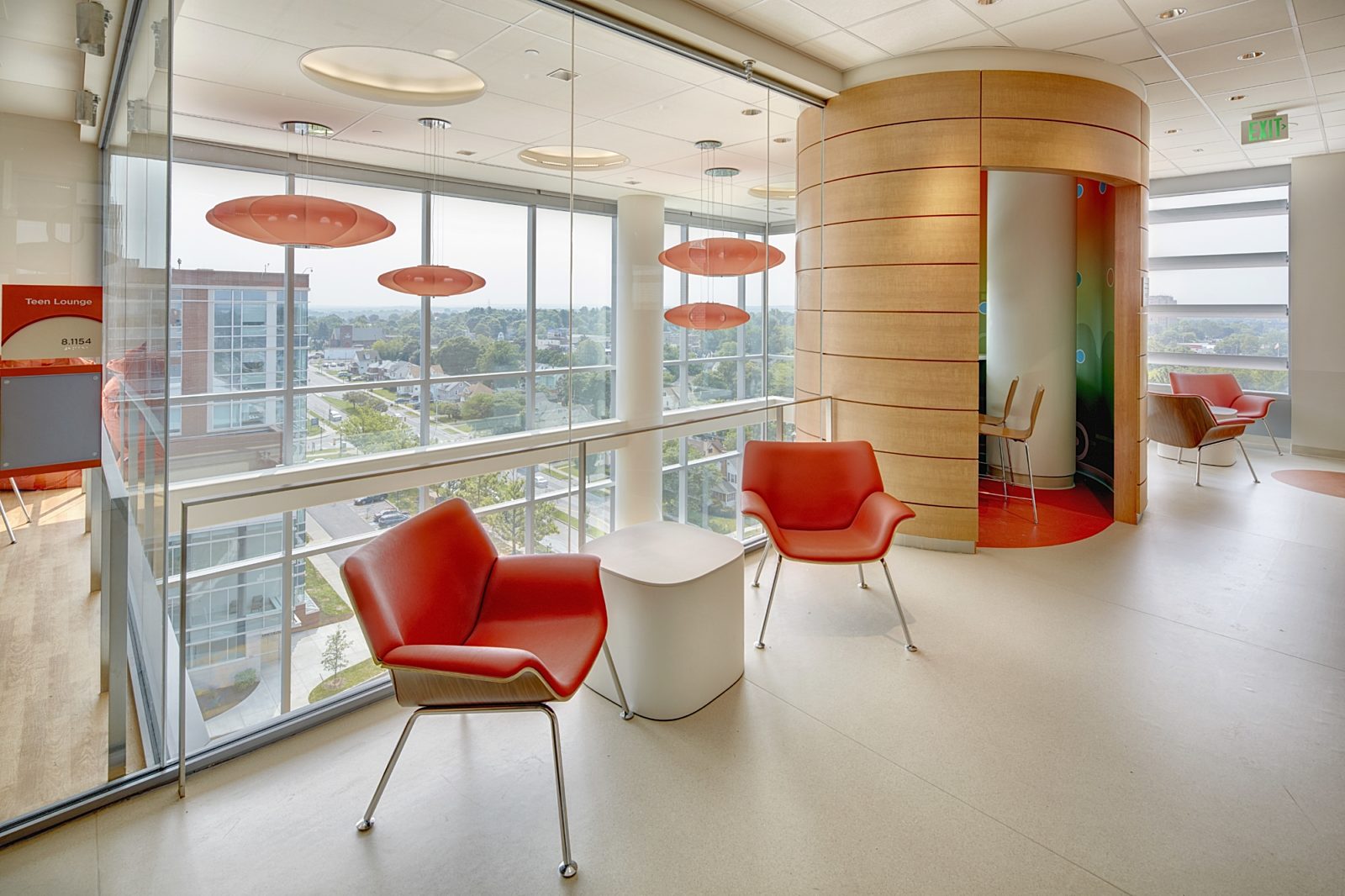 Golisano Children’s Hospital is a 245,000-sq. ft. facility located adjacent to the University of Rochester’s Medical Center. The character of the interiors of the children’s hospital is friendly & welcoming, nurturing healing by giving patients and their families a sense of choice and control while providing their medical providers an engaging place to work.
